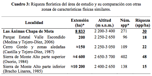 La sierra de Las Ánimas fue decretada como área natural protegida (ANP) el 15 de mayo de 1977 con la denominación de Parque Estatal Chapa de Mota; ello debido a que las condiciones ambientales y la relativa lejanía de centros poblacionales hacían del sitio un lugar ideal para instalar un observatorio astronómico (municipio de Chapa de Mota, 2009; SAM, 2013). Cómo el sitio aún conserva su estatus de conservación y presenta una vegetación original, entonces vale la pena realizar un estudio florístico, ya que este tipo de estudios es uno de los aspectos básicos para llevar a cabo diagnósticos biológicos regionales, estudios de impacto, investigación, gestoría y formulación de políticas de manejo en general. El conocimiento de las especies vegetales de un sitio dado, ligados a un tipo de ambiente físico particular, son de gran utilidad para soportar decisiones que validen tanto los modelos teóricos en ecología como al manejo ambiental (Palmer et al., 1995), sobre todo cuando existen presiones socioeconómicas para el cambio de uso de suelo.