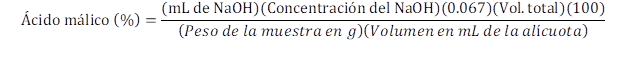 donde: 0.067 es un factor de conversión a ácido málico (peso miliequivalente del ácido málico) ácido orgánico predominante en los tejidos de las plantas MAC.