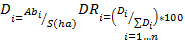 Donde Di es la dominancia absoluta, DRi es la dominancia relativa de la especie i respecto a la abundancia total, Abi es el área de copa de la especie i, y S la superficie de muestreo (ha).