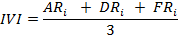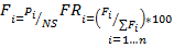 Donde Fi es la frecuencia absoluta, FRi es la frecuencia relativa de la especie i respecto a la abundancia total, Pi es el número de sitios en el que está presente la especie i, y NS número total de sitios de muestreo (ha).
