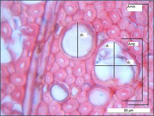 Las fotografías del plano transversal se tomaron con una cámara Cannon Power Short A640 acoplada a un microscopio marca Zeiss. Con el programa ImageJ (v.1.44) (Rasband, 2010), se midieron en los 20 cortes de cada una de las especies: el diámetro radial de los poros (d0), el ancho promedio de los poros ((d1 + d2)/2) y se contó el número de poros/mm2. Con el programa WinCell (v.2000) (Regent Instruments Inc, 2000) se estimó el porcentaje de ocupación de los poros [(A=p/A=m)*100], donde: (A=p: área del poro) dividido (A=m: área de la muestra) (fig. 1) y se describieron las características de los anillos de crecimiento de las especies.
