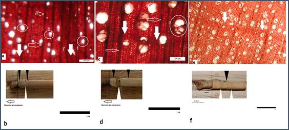 Aspidosperma polyneuron Müll. Arg. Presentó porosidad difusa, solitarios o en agrupaciones múltiples de 2-3 (4), los poros fueron ovalados. El diámetro radial de los poros fue de 226 µm (σ = 3,17). El ancho de los poros fue de 199 µm (σ = 3.46), el número fue de 210/mm2 y la estimación del área de ocupación de los poros fue de 5.97%. El parénquima se identificó como paratraqueal vasicéntrico. Los anillos de crecimiento se identificaron por el parénquima marginal y la disminución del diámetro de los poros (fig. 2e). Presentó anillos de crecimiento anuales. En las barrenas se identificaron los anillos formados en los años 2012 y 2013 (fig. 2f).