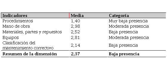 La tabla 1, muestra los resultados obtenidos para la dimensión planificación de mantenimiento, la cual presenta una media de 2,37 (baja presencia). Se pueden observar oportunidades de mejora en los indicadores procedimientos, mano de obra, equipos y clasificación del mantenimiento correctivo.