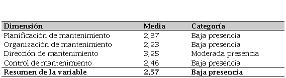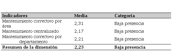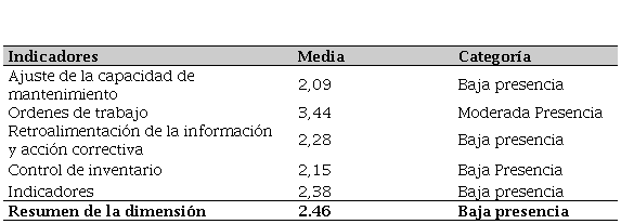 La tabla 2, muestra los resultados obtenidos para la dimensión organización de mantenimiento, al presentar una media de 2,23 (baja presencia). Se pueden observar oportunidades de mejora en el indicador mantenimiento centralizado.