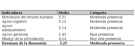 Igualmente, con respecto a la dimensión dirección de mantenimiento, se apreció en las instituciones en estudio un moderado manejo de la motivación del recurso humano, apoyo logístico, apoyo administrativo, con oportunidad de mejora en cuanto al apoyo gerencial lo cual contrasta con el manejo de la información donde se observó una muy alta presencia
