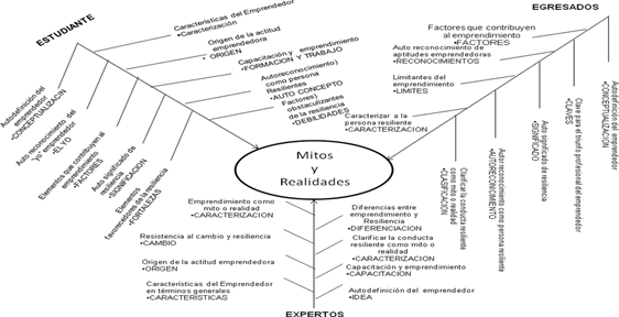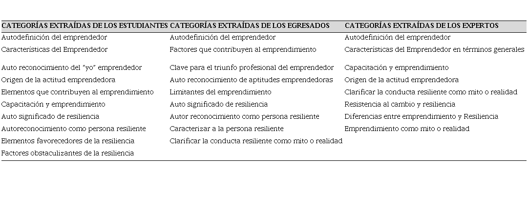 Con relación las categorías principales se destacan: autodefinición de emprendedor, características del emprendedor, auto reconocimiento del “yo” emprendedor, origen de la actitud emprendedora, clave para el triunfo profesional del emprendedor, elementos que contribuyen al emprendimiento, capacitación y emprendimiento, auto significado de resiliencia, autoreconocimiento como persona resiliente y la conducta resiliente como mito o realidad.