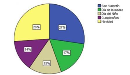 Se puede apreciar que de la población encuestada más de un veinte por ciento (27%) adquiere un peluche en el día de San Valentín; es importante mencionar que el 26% adquiere el producto en Navidad, lo que significa que para las personas encuestadas estas dos fechas son las más importantes en el año. (Gráfico 1)