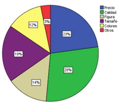 En el gráfico 2 se puede observar que en mayor proporción (29%) los encuestados consideraron la calidad como el factor más importante para realizar la compra, seguido del precio con un 23%, y el tamaño con un 19%; se puede observar que para los encuestados el factor figura fue relevante con un 14%.
