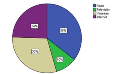De acuerdo a los datos obtenidos el 36% dijo que sería mejor conocer el negocio a través de la Radio, seguido del 30% de volantes e Internet con el 24%.