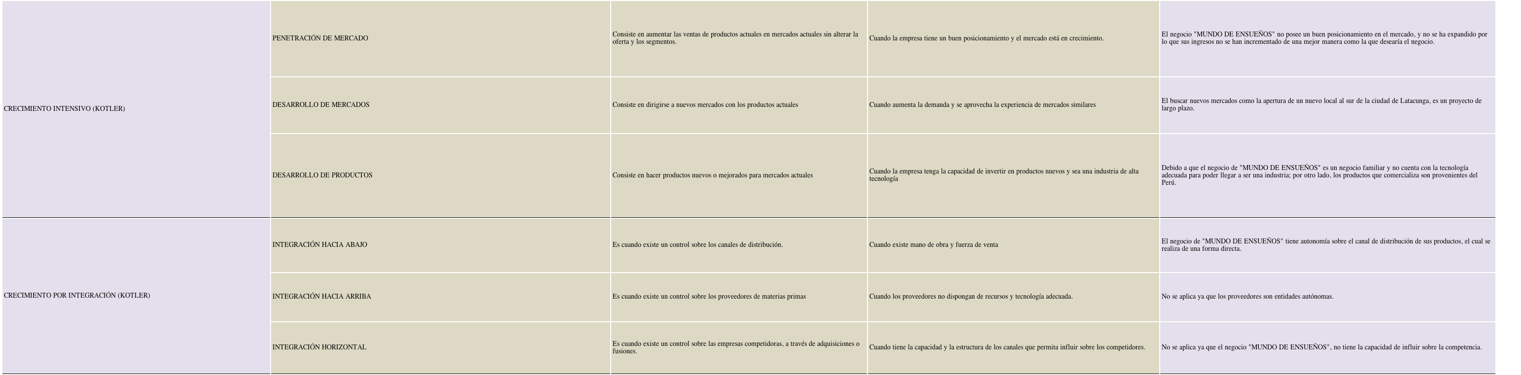 La empresa que defina un objetivo de crecimiento, la puede clasificar en tres niveles diferentes: crecimiento intensivo, crecimiento integrado y crecimiento por diversificación (Kotler, 1984; Kotler y Keller, 2012). (Tabla 2)