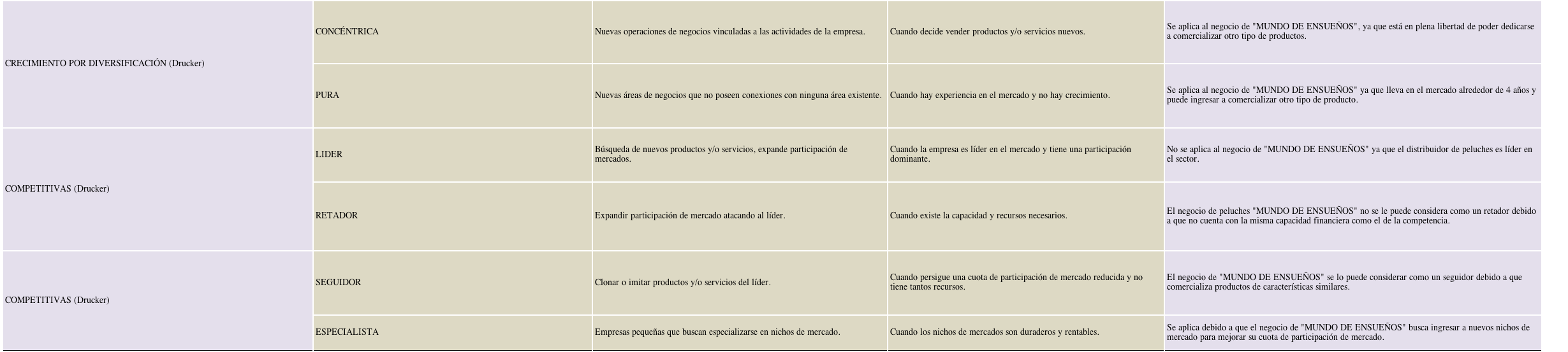 Al respecto, Peter Drucker sustenta que una empresa puede diversificarse y poseer fundamental integridad si todos los elementos mencionados se agrupan a una tecnología común (Drucker, 1987). Por otro lado, el valor acerca de dónde y cómo se alcanzarán los objetivos establecen la segunda condición de éxito empresario a través de la diversificación. Drucker propone que la unidad de mercado trabajará sobre una base diversificada sólo si se utiliza una genuina estrategia empresarial y este no será fuerte si la diversificación es un elemento agregado (Drucker, 1987). (Tabla 3).