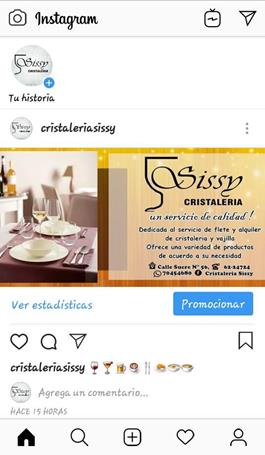 Instagram es un sitio donde se comparte especialmente fotos y videos, por lo tanto, la Cristalería “Sissy”, se ocupará de subir fotos o videos creativos, llamativos y agradables a la vista, de manera que estas fotos digan más que mil palabras, dirigidas a personas que requieren un servicio de buena calidad.