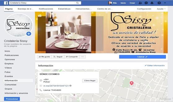Gracias al gran alcance que se tiene por medio de internet, la cristalería puede promocionar el servicio y tener una mejor relación con el público objetivo, y aprovechando que la Cristalería “Sissy” ya cuenta con Wi-Fi se procede a realizar la creación de cuentas, en Facebook, Instagram y WhatsApp.
