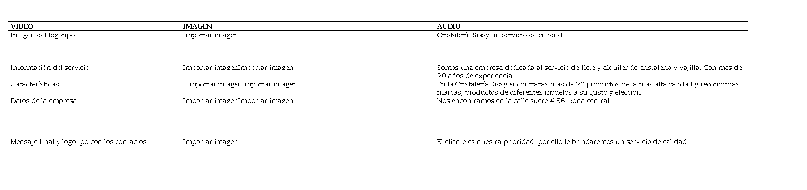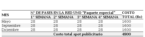 Al obtener los resultados de la encuesta se elige como canal televisivo óptimo la Red Uno al ser el medio de mayor preferencia. Haciendo uso del “paquete especial”, el spot publicitario de la Cristalería “Sissy” se transmitirá de lunes a viernes a las 9:00, 10:00, 16:00 y 20:00 horas; sábado a las 9:00, 13:00, 19:00 y 23:00 horas y domingo a las 12:00, 13:00, 14:00 y 22:00 horas, durante los meses de mayo, septiembre y diciembre, ya que son los meses donde hay más eventos que el resto del año.