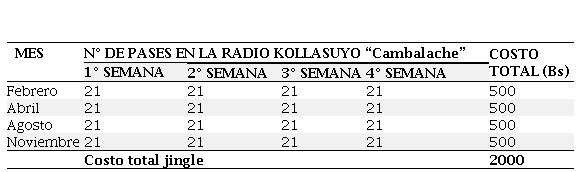 Por la utilización masiva y propiamente por las instituciones se realizará un jingle que se difundirá por la Radiodifusora Kollasuyo, ya que de acuerdo a los resultados obtenidos de la encuesta se elige como emisora de mayor frecuencia. El jingle durará 30 segundos y tendrá 3 pases al día en el programa Cambalache durante los meses de febrero, abril, agosto y noviembre, aprovechando los días festivos y fechas culturales.