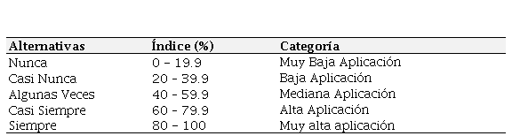 El análisis de los datos se realizó mediante la estadística descriptiva y como medida de tendencia central la mediana. Para la interpretación de los datos se utilizó el baremo de interpretación que se presenta en la tabla 1.