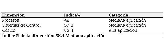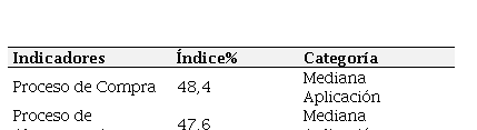 Con relación a la dimensión proceso, la cual obtuvo un índice porcentual promedio de 48, tal como lo muestra la tabla 2, que al ser comparado con el baremo de interpretación la ubica en la categoría mediana aplicación, lo cual indica que las empresas tienen un mediano desempeño en los procesos, específicamente los referidos a compras y almacenamiento que forman parte de su gestión de inventario. Este resultado puede considerarse como una consecuencia directa del comportamiento de sus indicadores cuyos resultados al ser comparados con el baremo de interpretación les ubicó en la categoría de mediana aplicación.