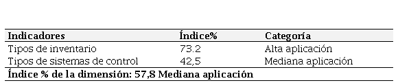 Con relación a la dimensión sistema de control, la tabla 3 muestra como resultado un índice porcentual promedio de 57,8 que al ser comparado con el baremo de interpretación le ubica en la categoría de mediana aplicación, lo cual indica que las empresas en estudio tienen un mediano desempeño en la aplicación de sus sistemas de control después de cada transacción de entrada o salida de productos, además, medianamente cuentan con políticas de vigilancia que les permita mantener un inventario en estado actualizado.