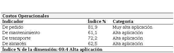 En cuanto a la dimensión costos operacionales, la tabla 4 muestra como resultado un índice porcentual promedio de 69,4 que al ser comparado con el baremo de interpretación le ubica en la categoría de alta aplicación. En lo que respecta a los indicadores que la componen se observa que el indicador denominado de pedido alcanzó resultados porcentuales de 81,9% que lo ubicaron en muy alta aplicación. En tanto que se observan oportunidades de mejoras para loa indicadores de mantenimiento, transporte y almacén, los cuales obtuvieron resultados (61,1; 72,2; y 62,5 respectivamente) que les ubicaron en la categoría de alta aplicación.