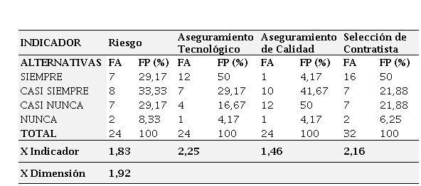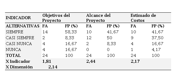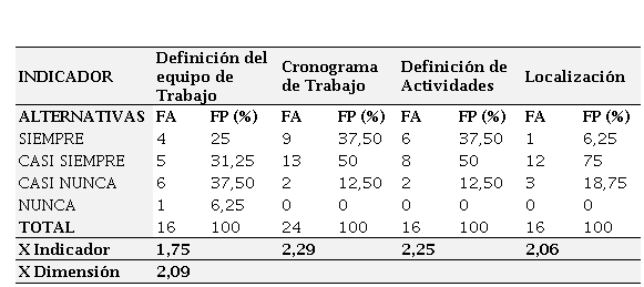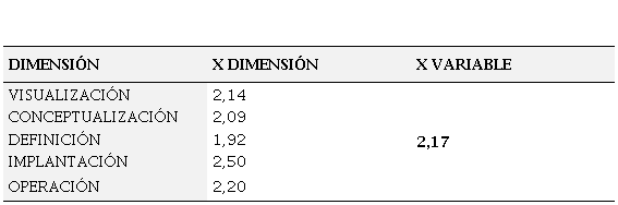 La tabla 3 muestra los resultados obtenidos para la dimensión conceptualización en la gestión de proyectos., la cual presenta una media de 2,09 (moderado cumplimiento). Teniendo en cuenta que ésta según PMBOK (2004) es la fase donde se recoge información de varias fuentes con diversos grados de completitud y confianza para desarrollar el plan de gestión del proyecto y asegurar su cabal cumplimiento; los resultados de los indicadores en su mayoría de cumplimiento moderado, indican oposición a lo expresado por el autor y evidencian problemas significativos en la manera de abordar el proyecto, por ejemplo es muy posible que el personal asignado no tenga las capacidades y/o destrezas necesarias en el área a trabajar. De igual manera estos resultados permiten predecir cierto desfase con los objetivos propuestos al comienzo del proyecto a ejecutar, así como que el proyecto se desarrolle en sitio y tiempo inadecuado generando retrasos y costos adicionales, entre otros.