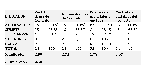 El resultado de este indicador evidencia la presencia de ciertos inconvenientes en la procura de materiales y quipos, que incide sobre el stock de materiales, tiempo de ejecución y costos; lo que contrasta con lo expresado por PDVSA (1999), al afirmar que la procura de materiales es una actividad primordial para lograr la ejecución del proyecto dentro del tiempo y calidad planificados; para lo que es necesaria la coordinación de programas de seguimiento, control y aseguramiento de calidad de los materiales, y asegurar que la compra de materiales y equipos se haga de acuerdo con las listas de proveedores aprobados.