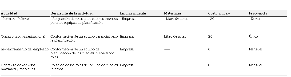 · Gestión de resistencias y grupos de influencia.- Generar representantes de los cliente internos, que coadyuven en la aplicación de la estrategia y se constituyan un referente para los demás clientes internos, siendo una asignación rotativa.