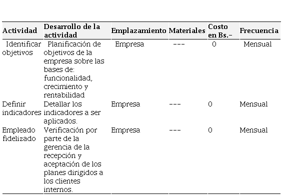 Tras haber realizado un diagnóstico del estado actual de la fidelización de los clientes internos de la pizzería “El Pizarrón” en la ciudad de Potosí, se ha llegado a definir la columna vertebral del grado de relacionamiento y la forma como debe ser encarada en la empresa, debiendo ser éstas adecuadas y duraderas, para este efecto se hace necesario estratificar indicadores que se constituyen en información base, como resultado de los procesos de análisis concretizado en este mismo documento: