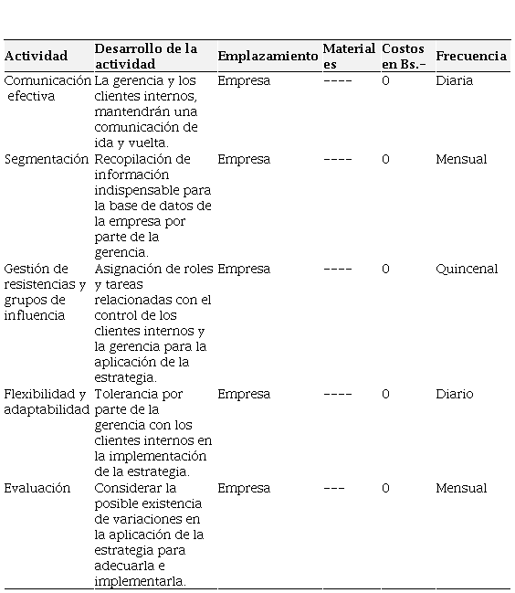 Se refiere a la definición de las etapas de la implementación de la estrategia de endomarketing propuesta, teniendo en cuenta que el proceso debe ir de arriba hacia abajo, y también de abajo hacia arriba para garantizar la cobertura en la empresa. Esto debe reflejarse en un calendario para que los empleadores como los clientes internos lo puedan cumplir.