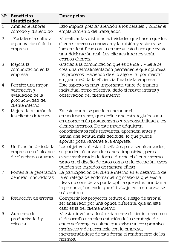 Uno de los aspectos importantes del presente estudio fue de dar a conocer los beneficios que brinda la implementación de una estrategia de endomarketing para la fidelización de los clientes internos de la empresa pizzería “El Pizarrón” en la ciudad de Potosí, lo cuales se denotan en la tabla 7.