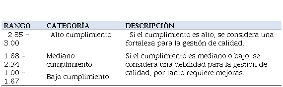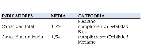 Ahora bien, al desglose de los indicadores utilizados para medir la dimensión, de seguido se especifican los resultados obtenidos, mostrados en la tabla 3, la cual recoge el resultado de la dimensión indicadores de la gestión de calidad y de sus indicadores: capacidad total, capacidad utilizada, servicio al cliente y nivel de cumplimiento.
