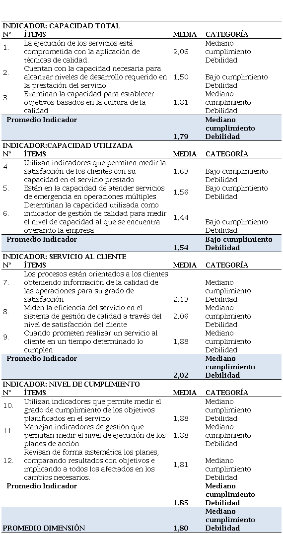 De esta forma, se evidenció mediano cumplimiento para la dimensión en conjunto bajo una media de 1,80 siendo una debilidad de la gestión de calidad, como ya se mencionó, evidenciándose también mediano cumplimiento en los indicadores capacidad total servicio al cliente y nivel de cumplimiento, con mediano cumplimiento en todas las actividades medidas en estos indicadores a través de los ítems aplicados en ellos, resaltando una actividad medida con bajo cumplimiento en la capacidad total, referida a si cuentan con la capacidad necesaria para alcanzar niveles de desarrollo requerido en la prestación del servicio con una media de 1,50, atribuyéndole debilidades a la gestión de calidad en todos los aspectos medidos.