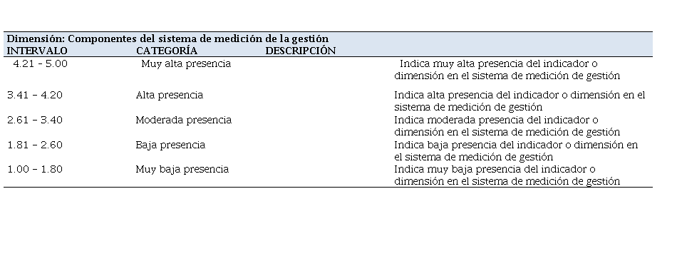 El análisis de los datos se realizó mediante la estadística descriptiva, a través del estudio de las medias aritméticas y la desviación estándar. A tal efecto, se diseñó un baremo, para el análisis e interpretación de la media aritmética de la dimensión componentes del sistema de medición de la gestión mostrado en la tabla 1.