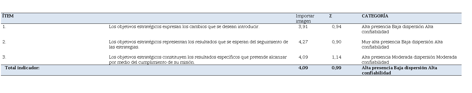Esta alta presencia, mostrada en el indicador definición de objetivos, obedece a la percepción de los encuestados en cuanto a los ítems relacionados. Así, se observó que para el ítem 2 se arriba a muy alta presencia, cuya media es de 4,27, indicando que con muy alta frecuencia los objetivos estratégicos representan los resultados que se esperan del seguimiento de las estrategias. A su vez, catalogaron con alta presencia el que los objetivos estratégicos expresen los cambios que se desean introducir (3,91), y constituyan los resultados específicos que se pretenden alcanzar por medio del cumplimiento de su misión (4,09).