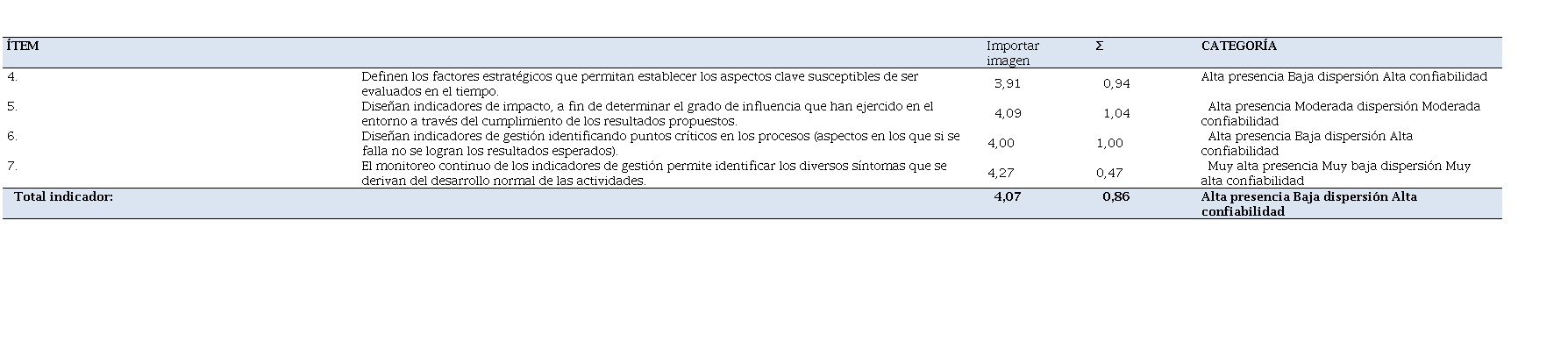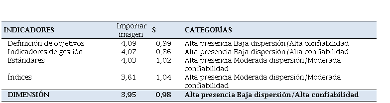 En la tabla 4 se presentan los resultados del indicador: indicadores de gestión, como otro de los componentes del sistema de medición de la gestión. La media para este indicador se ubicó en 4,07, mostrando alta presencia de los indicadores de gestión, como otro de los componentes del sistema de medición de la gestión que se analiza. Su desviación es de 0,86, indicando baja dispersión y alta confiabilidad de las respuestas.