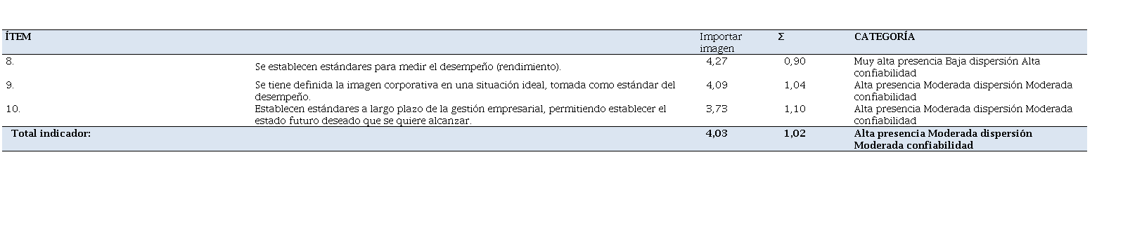 Al detalle se observó, que las gerencias bajo estudio, otorgan muy alta presencia al hecho de que establezcan estándares para medir el desempeño (rendimiento) (4,27). Mientras que realizan con alta presencia el que se tenga definida la imagen corporativa en una situación ideal, tomada como estándar del desempeño (4,09); y establezcan estándares a largo plazo de la gestión empresarial, permitiendo establecer el estado futuro deseado que se quiere alcanzar (3,73). Adicional a las medias alcanzadas, se observa desviación de baja dispersión y alta confiabilidad para el ítem 8 (0,90); y de moderada dispersión y moderada confiabilidad para los ítem 9 y 10 (1,04 y 1,10).