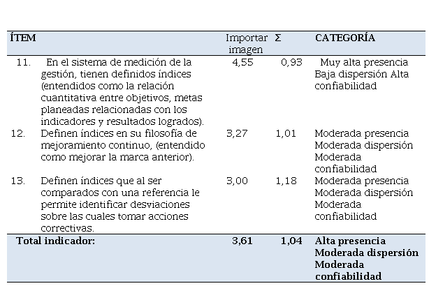 Al detallar los resultados, se observa muy alta presencia de la actividad referida a si en el sistema de medición de la gestión, tienen definidos índices (entendidos como la relación cuantitativa entre objetivos, metas planeadas relacionadas con los indicadores y resultados logrados) (4,55). A su vez, las respuestas dadas por los encuestados para este ítem, se concentraron en el intervalo de baja dispersión y alta confiabilidad (0,93).