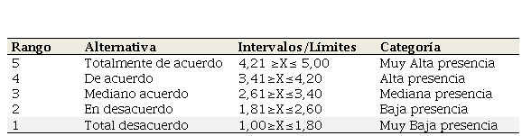 En este sentido, para la interpretación de la media se construyó un baremo de medición, donde se expuso, de acuerdo a la alternativa de respuesta con su valor, el intervalo y la categoría a la cual pertenece la puntuación obtenida.