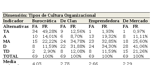 De igual manera puede notarse que la media para este indicador fue de 4,03, ubicándose en la categoría de muy alta presencia, lo cual implica que en las universidades públicas del municipio Cabimas la cultura burocrática tiene una alta presencia.