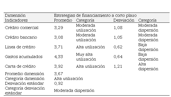 En cuanto a las estrategias de financiamiento a corto plazo, los resultados se muestran en la tabla 9 donde se observa un promedio de alta utilización en 3,67 con una moderada dispersión en los datos de 0,92. Esto demuestra que dentro de las estrategias de financiamiento a corto plazo los indicadores crédito comercial (3,29) y crédito bancario (3,08) representan una moderada utilización, los cuales son puntos de mejora para las empresas analizadas. Asimismo, es importante destacar el nivel de alta utilización en los indicadores línea de crédito (3,71) y carta de crédito (3,92) en las empresas siderúrgicas de Venezuela. Por otro lado, existe una muy alta utilización de los gastos acumulados con un promedio de 4,33.