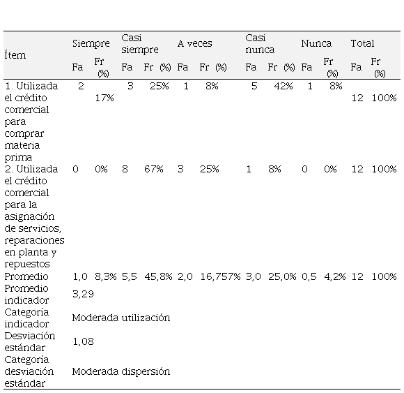 En este sentido, el promedio arrojado fue de 3,29 ubicándose en una categoría de moderada utilización y una moderada dispersión de 1,08. Por lo tanto, se puede decir que las empresas siderúrgicas de Venezuela según la escala planteada en cierta medida no emplean el crédito comercial para la compra de materia prima pero sí para otras actividades como adquirir servicios, reparaciones en planta y repuestos.