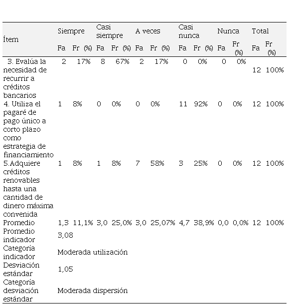Con relación a la tabla 5 donde se observan los resultados del crédito bancario, en el ítem 3 se muestra que un 67% de los encuestados afirmaron casi siempre evalúan la necesidad de recurrir a créditos bancarios. En cuanto al ítem 4, un 92% contestó casi nunca utilizan el pagaré de pago, mientras para el ítem 5 el 58% expresó que a veces adquiere créditos renovables hasta cierta cantidad de dinero máxima convenida. Se evidencia un promedio de 3,08 ubicándose en una categoría de moderada utilización y una desviación estándar de 1,05 representando una moderada dispersión de los datos.