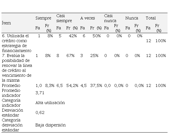 Estos hallazgos reflejan un promedio de 3,71 ubicándose en una categoría de alta utilización y una desviación estándar de baja dispersión en los datos de 0,62. Por consiguiente, estos resultados se alinean al enfoque de a Gitman y Zutter (2012) quienes en un sentido amplio exponen que una línea de crédito es un acuerdo entre un banco comercial y una empresa que especifica el monto del financiamiento a corto plazo, sin garantía, que el banco tendrá disponible para la compañía durante un periodo determinado.