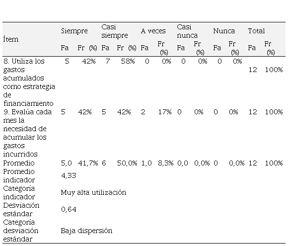 En cuanto a los gastos acumulados cuyos resultados se observan en la tabla 7, se evidenció para el ítem 8 como un 58% de las empresas encuestadas opinó que casi siempre son utilizados como estrategia de financiamiento. Para el ítem 9 en relación con evaluar cada mes la necesidad de acumular los gastos incurridos un 42% aseveró que siempre lo hace. Se observa un promedio de muy alta utilización en 4,33 cuya dispersión de los datos es baja según el 0,64 observado.