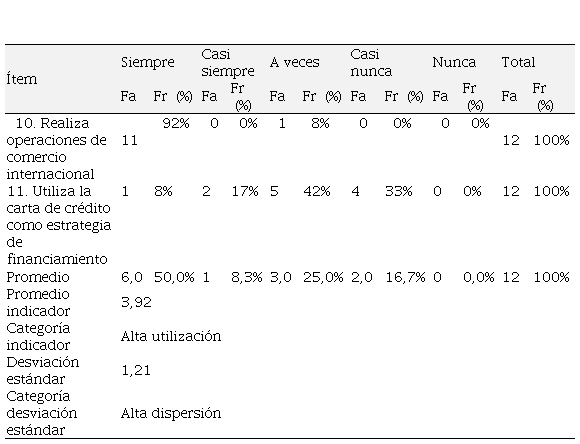 En relación a la carta de crédito como estrategia de financiamiento a corto plazo reflejado en la tabla 8 con respecto al ítem 10 se observa cómo el 92% de los encuestados expresó que las empresas siderúrgicas siempre realizan operaciones de comercio internacional. Mientras en el ítem 11 el 42% de la población encuestada manifestó que a veces utiliza la carta de crédito para financiar estas operaciones. Por otra parte, se observa un promedio de alta utilización en 3,92 en esta estrategia y una dispersión en los datos de 1,21, ubicándose en una categoría de alta dispersión.