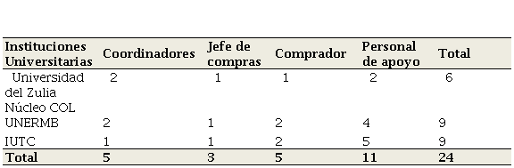 Las unidades de observación o unidades informantes de cada una de las instituciones de educación superior, fueron los coordinadores, jefes de compras, comprador, personal de apoyo, los cuales se especifican en el tabla 1.