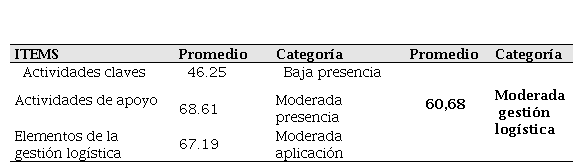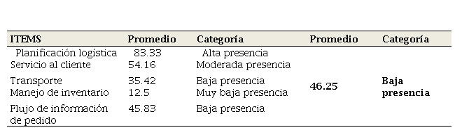 Al ver los resultados se identifican con alta presencia la planificación logística, moderada presencia el servicio al cliente, con baja presencia el transporte así como el flujo de información de pedido y con muy baja presencia el manejo de inventario. A juicio de la investigadora estos aspectos deben ser considerados como oportunidades de mejora por cuanto las actividades claves deben desarrollarse con la finalidad de asegurar que los procesos de la organización se planifiquen y desarrollen contemplando los requisitos logísticos del cliente.