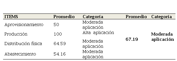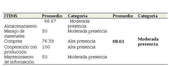 Estos resultados de moderada presencia permiten visualizar poca coincidencia con la teoría manejada por Taboada (1999), quien plantea que si se toma como referencia el flujo material, que es la columna vertebral de la logística, pueden entonces identificarse los elementos del sistema de gestión de logística los cuales son aprovisionamiento, producción, distribución física y abastecimiento.
