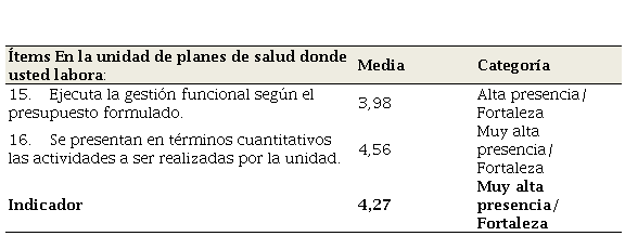 Para el indicador presupuesto, se evidencia según la tabla 9 un promedio de 4,27 ubicándolo en la categoría muy alta presencia, señalando fortaleza. Este resultado es producto al considerar los encuestados que con alta presencia se ejecuta la gestión funcional según el presupuesto formulado (3,98) y con muy alta presencia se presentan en términos cuantitativos las actividades a ser realizadas por la unidad (4,56).