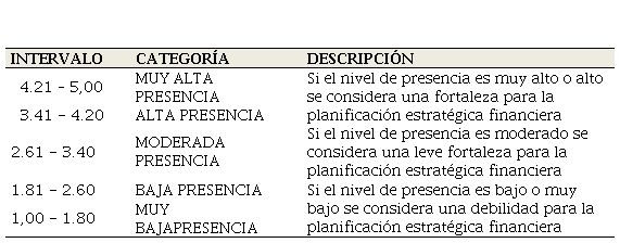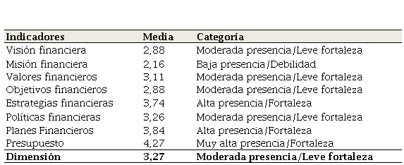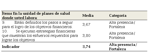 En lo concerniente al indicador estrategias financieras, los resultados obtenidos se recogen en la tabla 6, donde se aprecia una media de 3,73 ubicándolo en la categoría de alta presencia, señalando fortaleza al considerar los sujetos informantes que están definidos los pasos a seguir para el logro de los objetivos financieros (3,67) y que se ejecutan estrategias financieras que muestran los esfuerzos requeridos para lograr los objetivos (3,80).