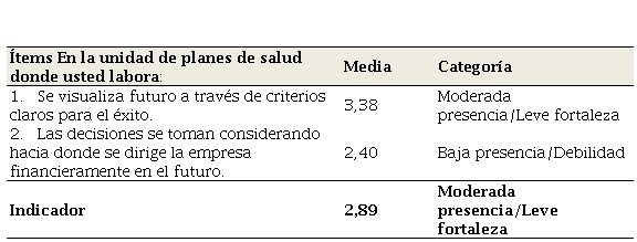 La tabla 1, muestra los resultados obtenidos sobre el indicador visión financiera perteneciente a la dimensión elementos de la planificación financiera, observándose un promedio de 2,89 ubicándola en la categoría de moderada presencia, señalando leve fortaleza. En este sentido, en opinión de los sujetos informantes, en las unidades de planes de salud donde ellos laboran, con moderada presencia se visualiza el futuro a través de criterios claros para el éxito (3,38); no obstante con baja presencia las decisiones se toman considerando hacia donde se dirige la empresa financieramente en el futuro (2,40).